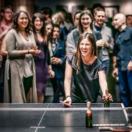 A fun, clean, friendly spot to play ping pong, Atari, and other games while having a bite (just bar food) or having a drink. It's underground, but tastefully decorated (every wall is decorated by murals). There's a bathtub filled with pingpong balls!