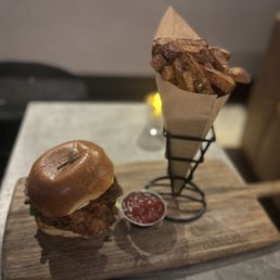 o I stumbled upon Spin by default. I was headed to the ORCHESTRA NOIR concert at the Warner Theater and wanted a drink and a snack. I went to proper 21 but the bar was full so I decided to head across the street. This was in the basement but the music instantly caught my attention. I mean who can bypass the Tootsie Roll. the music was on point. This is a good after work spot. I ordered the lemon pepper fish based on a recommendation by the bartender and a French 75 with Hendrix. The music here is your old school house music which I love. The music that keeps the floor full too bad these patrons were too young too appreciated it .